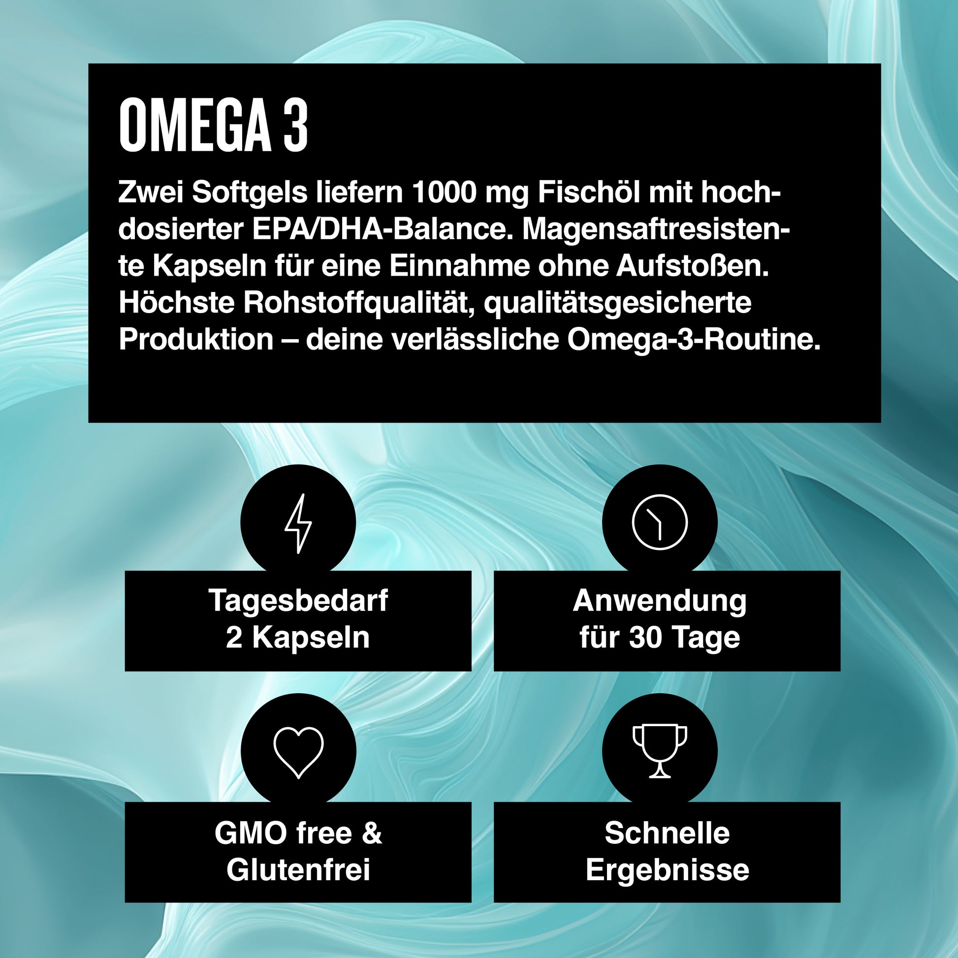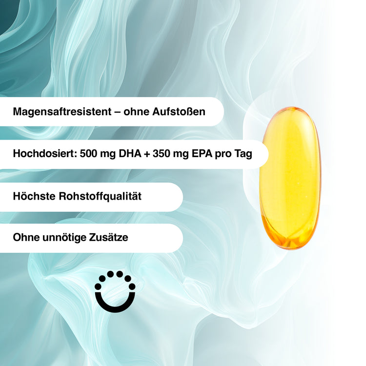 Many Omega 3 supplements are difficult to tolerate in everyday life. Our enteric-coated softgel shell supports a noticeably pleasant intake. The EPA:DHA content is clearly dosed, the Capsules are tasteless and can be easily integrated into your daily routine.
